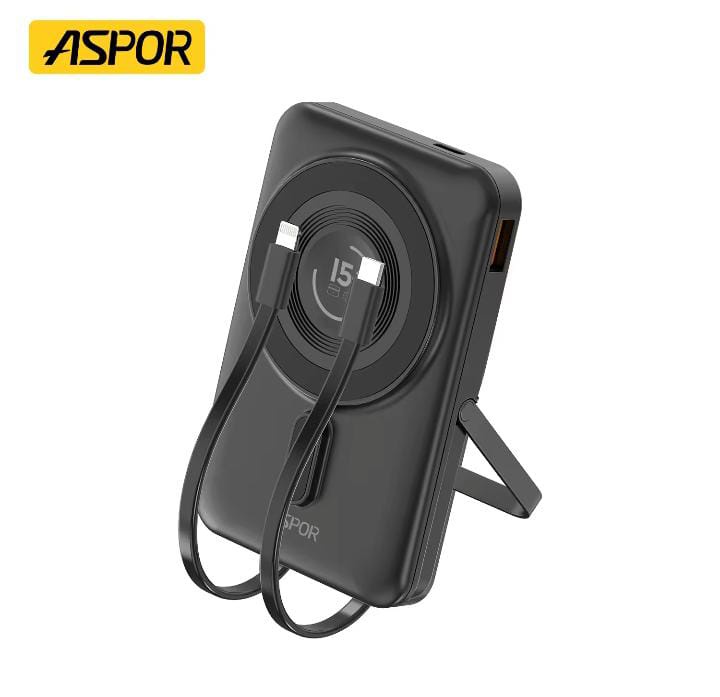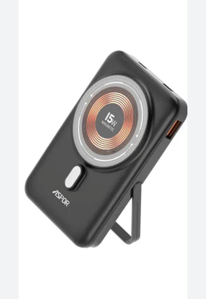 "بور بانك aspor بسعة 10000mAh يدعم الشحن اللاسلكي لتجربة شحن سهلة وسريعة. تصميم أنيق ومحمول، مثالي للسفر والاستخدام اليومي، يشحن أجهزتك بكفاءة سواء بالكابل أو لاسلكياً."